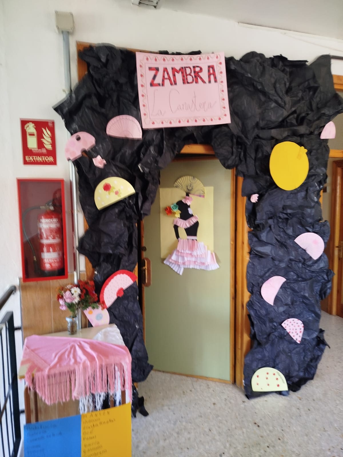 El decorado de la puerta del aula de música, simulando la entrada a una cueva flamenca sirvió de calentamiento para la fiesta flamenca, que se hizo en el recreo del viernes entre alumnado y profesorado. Una semana con mucho duende. ¡Feliz día del flamenco!